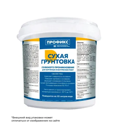 Сухой состав необходимо смешать с водой из расчета 0,5 кг (1 банка) сухой грунтовки глубокого проникновения «Профикс» на 10 – 12 литров воды. Температура воды должна быть от +5ºС до +35ºС. Дрельюмиксером создается сильный водоворот, в это время сухая смесь постепенно засыпается по краю емкости и перемешивается до получения однородной консистенции и отсутствия комков. Затем состав выдерживается в течении 10 – 15 минут и повторно перемешивается. Допускается выпадение осадка. Во время проведения работ раствор рекомендуется регулярно перемешивать. Приготовленная порция раствора должна быть израсходована в течение 2 суток.
