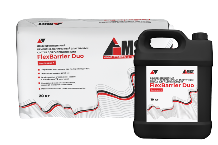 Двухкомпонентный цементно-полимерный эластичный состав для гидроизоляции FlexBarrier Duo применяется для гидроизоляции и защиты бетонных и железобетонных конструкций, цементных стяжек и штукатурок, а также для гидроизоляции бассейнов, душевых, ванных комнат, балконов и террас. Обеспечивает перекрытие активных трещин в основании до 0,8 мм и сохраняет свои свойства при отрицательных температурах до -20°C.
